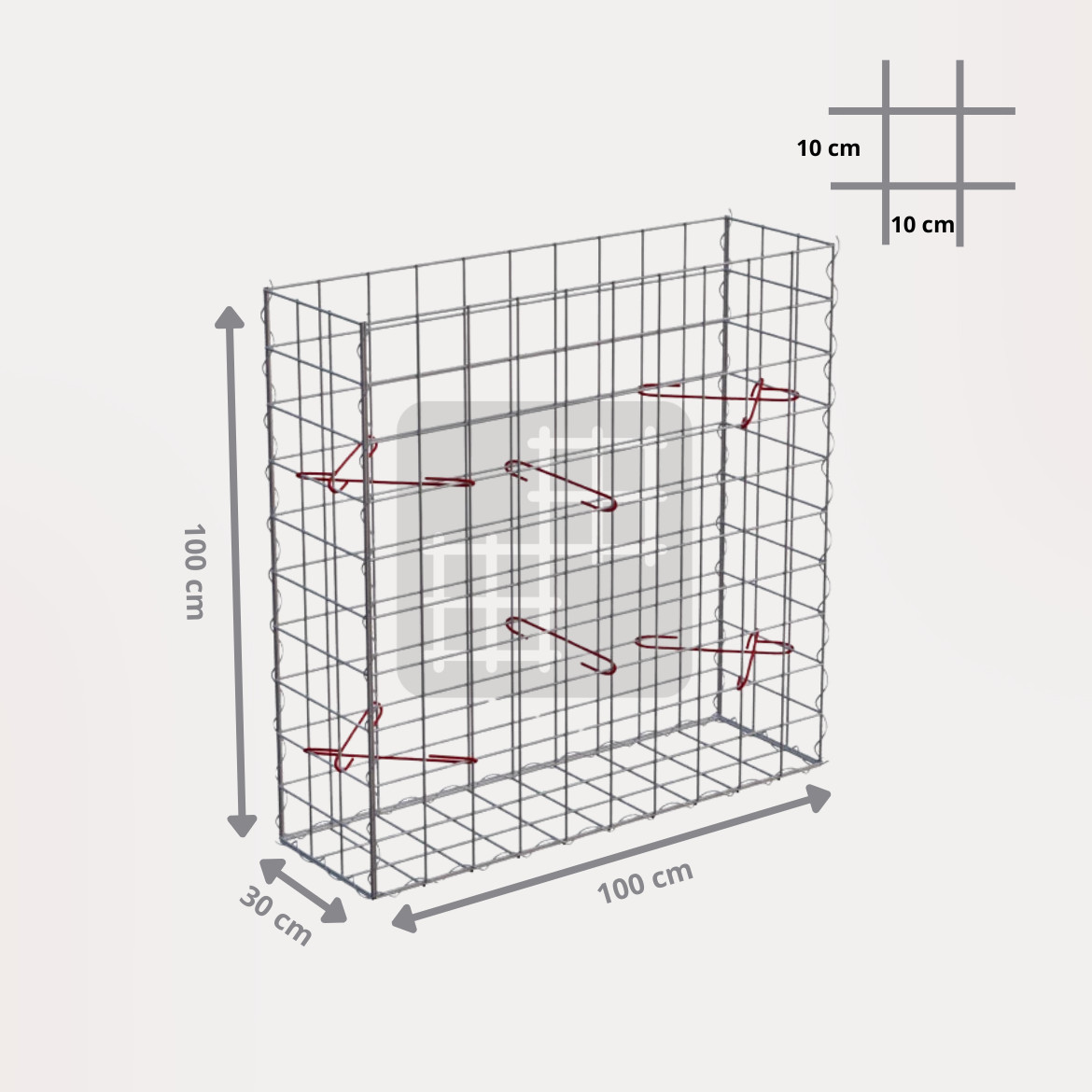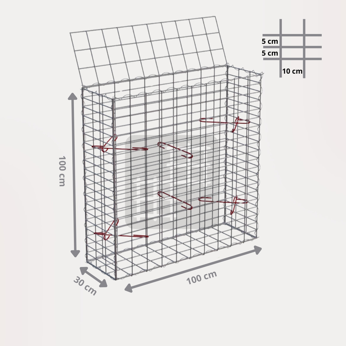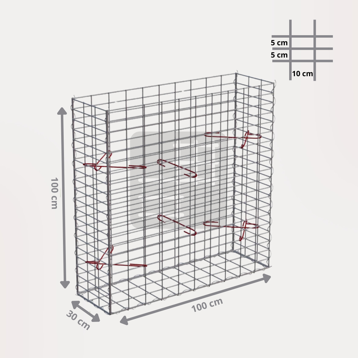Ein Gabionenkorb ist eine selbsttragende Konstruktion, die aus 6 geschweißten verzinkten Gabionenmatten, mehreren Spiralen und Montagehaken besteht. Die Gabionenmatten werden aus geschweißtem Draht mit einem Durchmesser von 4 mm hergestellt. Der Draht ist oberflächlich behandelt mit einer dicken Schicht Galfan (95% Zn, 5% Al) 350g / 1m².