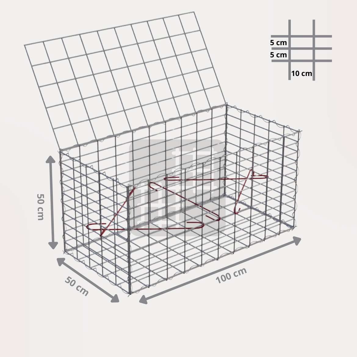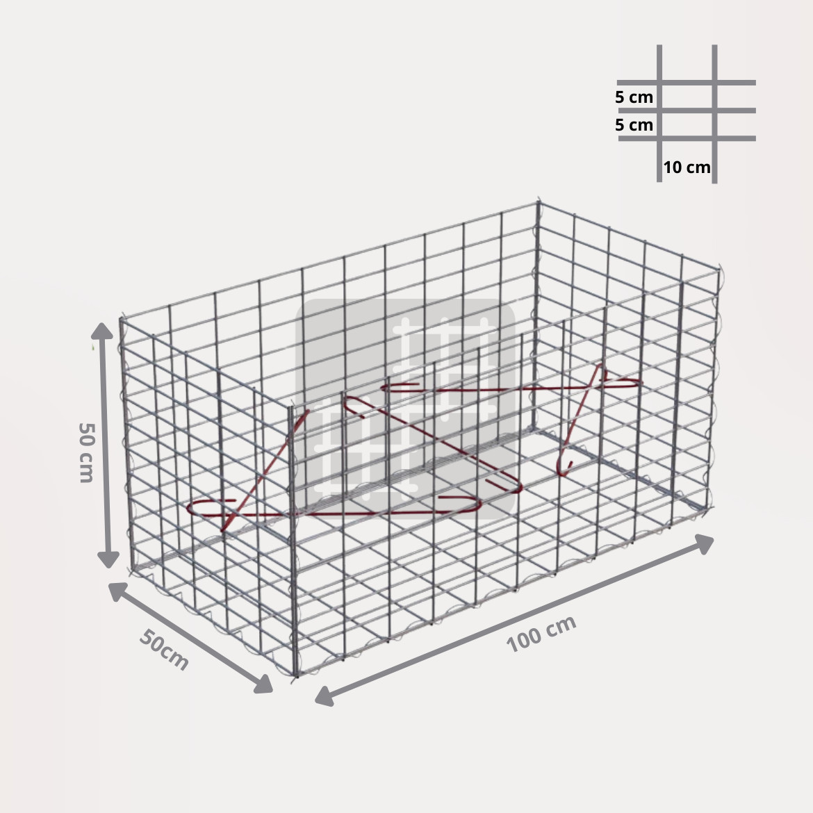 Ein Gabionenkorb ist eine selbsttragende Konstruktion, die aus 6 geschweißten verzinkten Gabionenmatten, mehreren Spiralen und Montagehaken besteht. Die Gabionenmatten werden aus geschweißtem Draht mit einem Durchmesser von 4 mm hergestellt. Der Draht ist oberflächlich behandelt mit einer dicken Schicht Galfan (95% Zn, 5% Al) 350g / 1m².