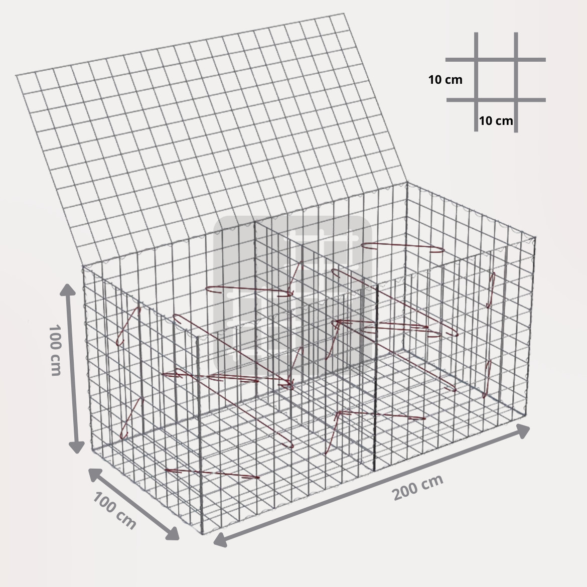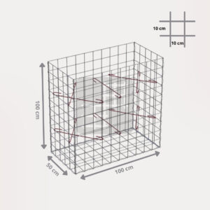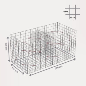 Ein Gabionenkorb ist eine selbsttragende Konstruktion, die aus 6 geschweißten verzinkten Gabionenmatten, mehreren Spiralen und Montagehaken besteht. Die Gabionenmatten werden aus geschweißtem Draht mit einem Durchmesser von 4 mm hergestellt. Der Draht ist oberflächlich behandelt mit einer dicken Schicht Galfan (95% Zn, 5% Al) 350g / 1m².