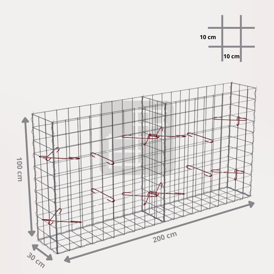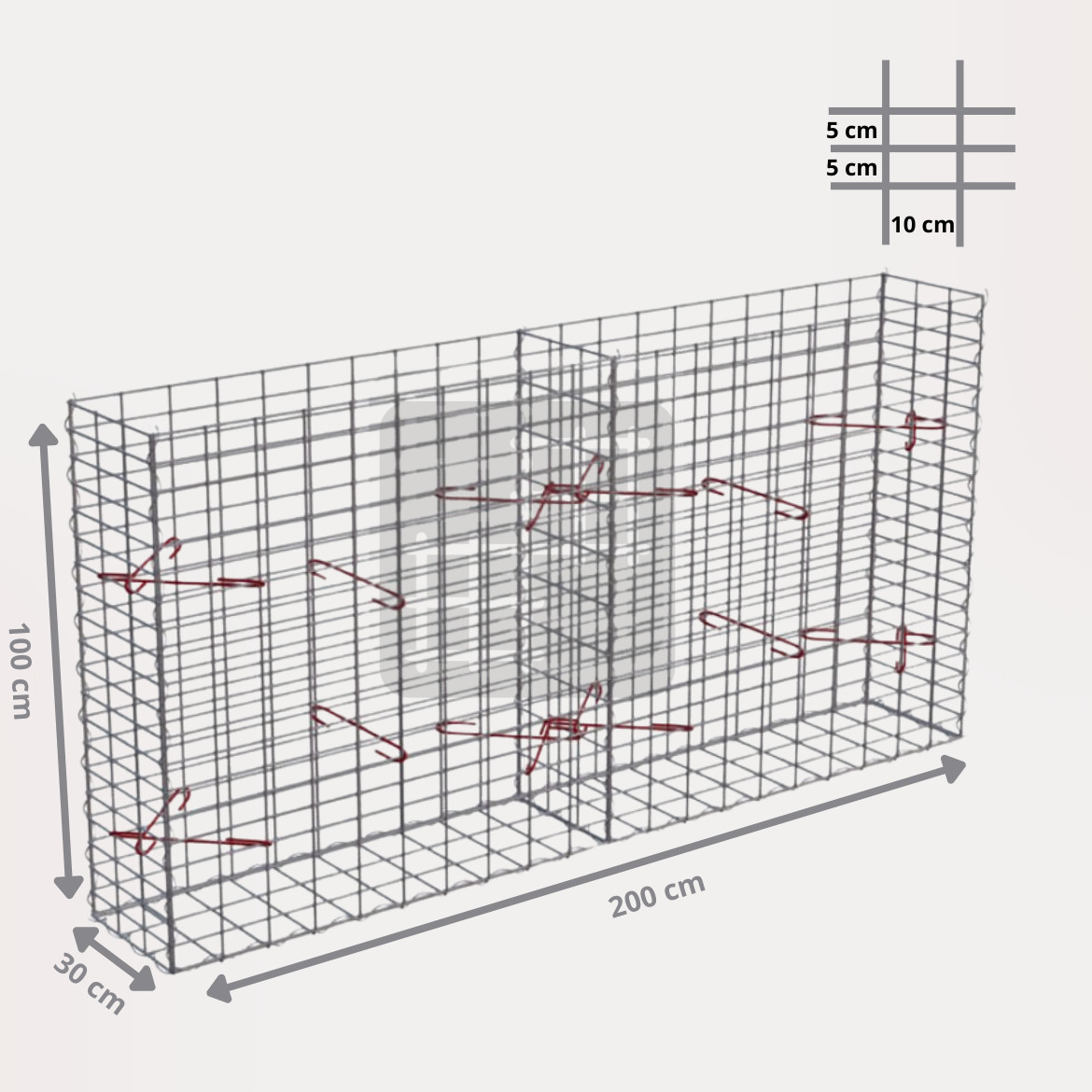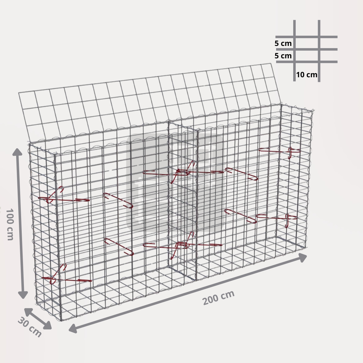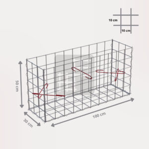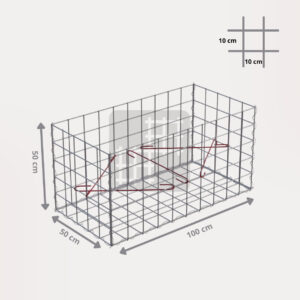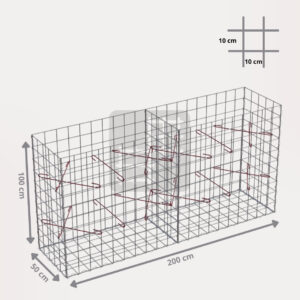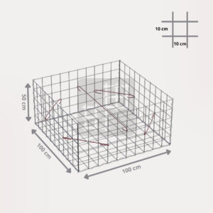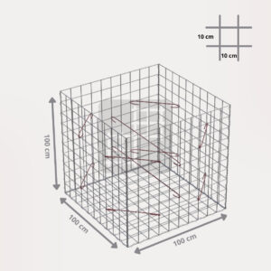 Ein Gabionenkorb ist eine selbsttragende Konstruktion, die aus 6 geschweißten verzinkten Gabionenmatten, mehreren Spiralen und Montagehaken besteht. Die Gabionenmatten werden aus geschweißtem Draht mit einem Durchmesser von 4 mm hergestellt. Der Draht ist oberflächlich behandelt mit einer dicken Schicht Galfan (95% Zn, 5% Al) 350g / 1m².