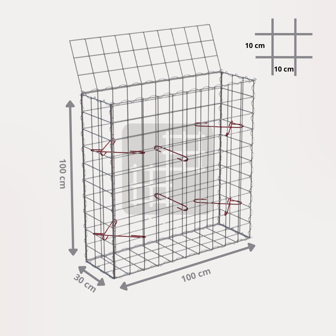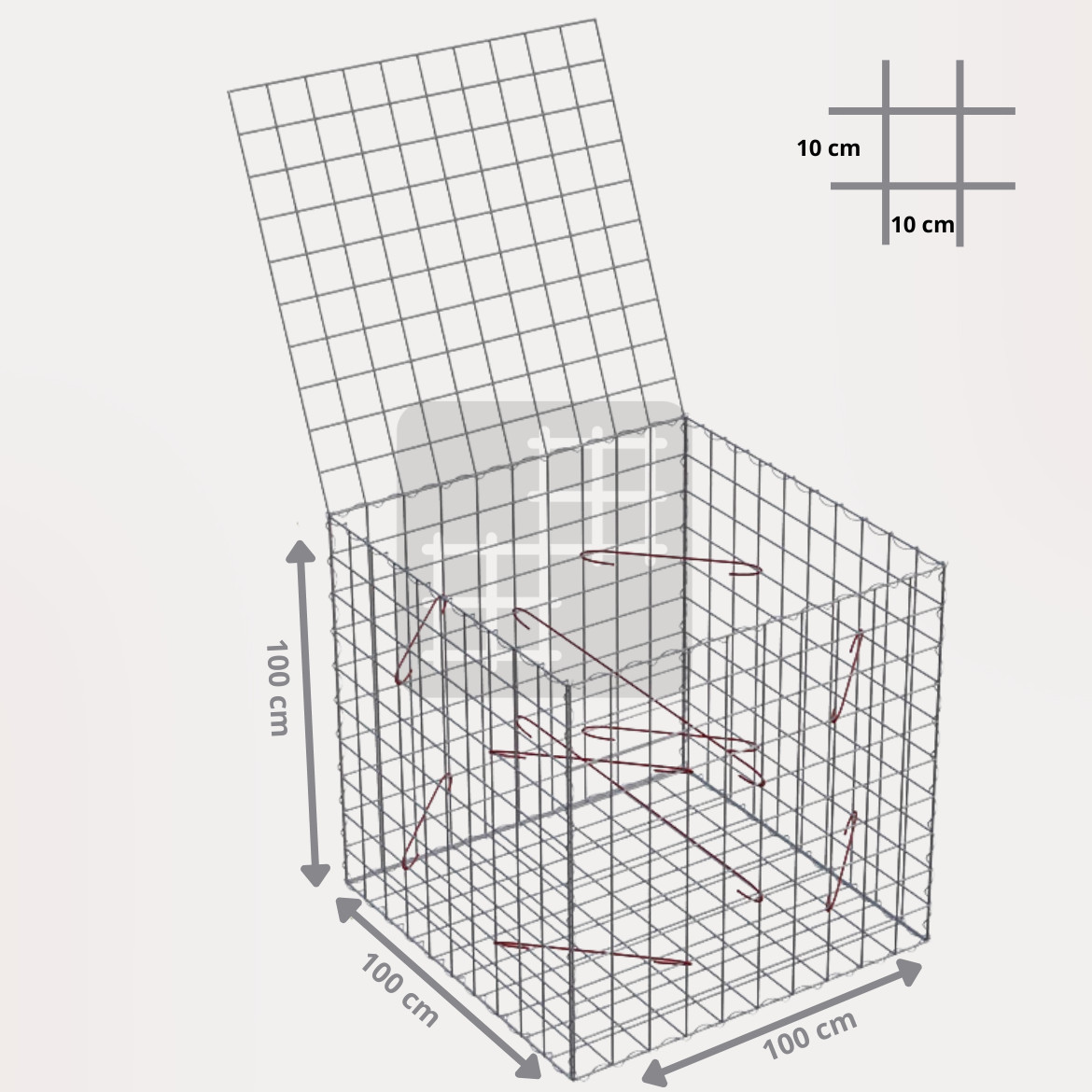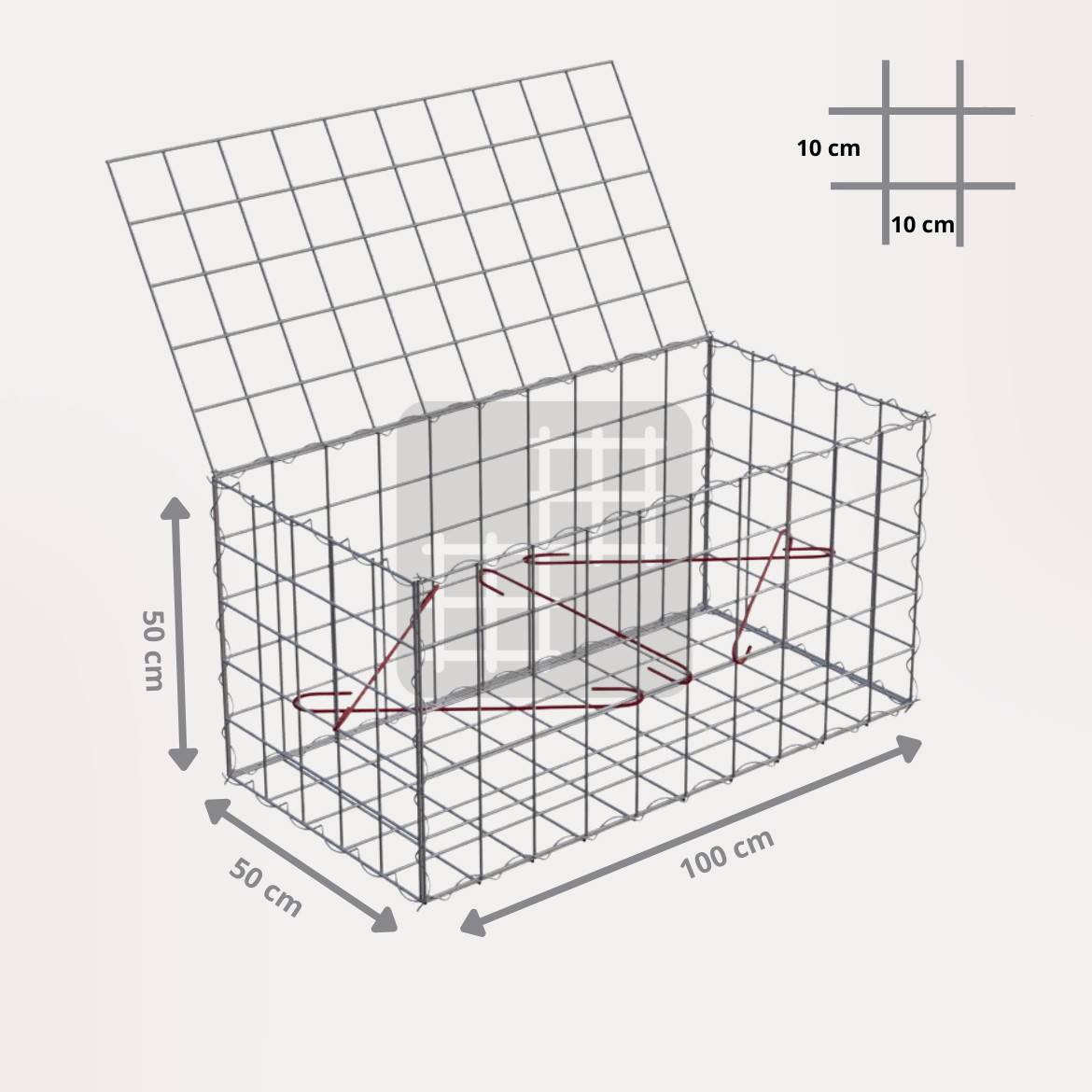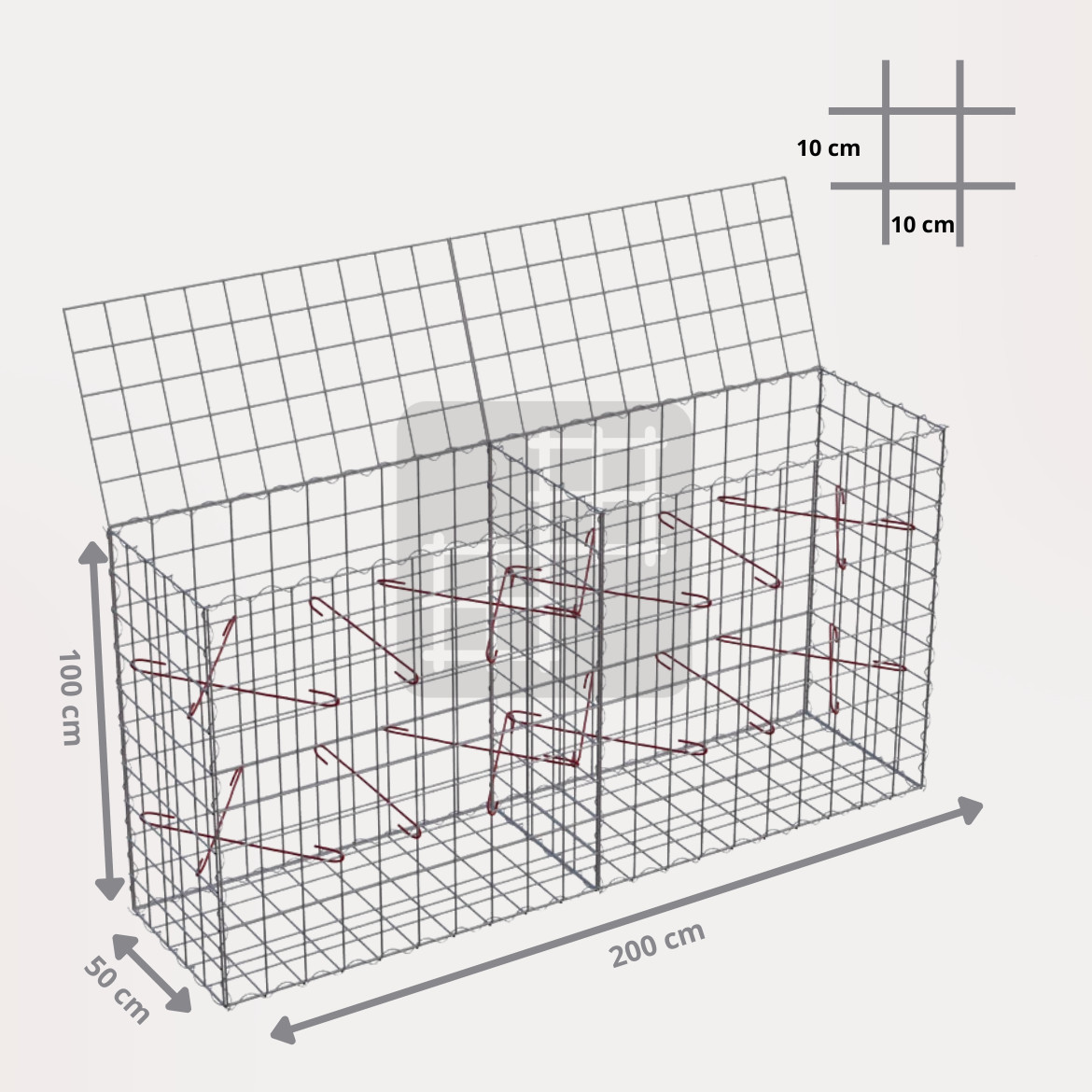 Ein Gabionenkorb ist eine selbsttragende Konstruktion, die aus 6 geschweißten verzinkten Gabionenmatten, mehreren Spiralen und Montagehaken besteht. Die Gabionenmatten werden aus geschweißtem Draht mit einem Durchmesser von 4 mm hergestellt. Der Draht ist oberflächlich behandelt mit einer dicken Schicht Galfan (95% Zn, 5% Al) 350g / 1m².