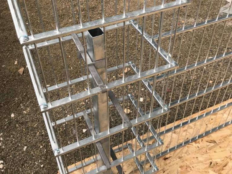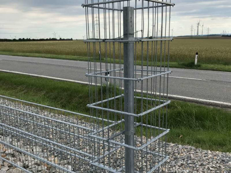 Die Gabionensäulen sind feuerverzinkt und bestehen aus horizontalen U-Profilen, die an vertikale Stahlstangen mit einem Durchmesser von 4 mm, angeschweißt werden. Die vertikalen Stahlstangen haben einen Abstand von 50 mm und die U-Profile sind 200 mm voneinander entfernt, wodurch eine Maschenweite (MW) von 50×200 mm entsteht. Dieses Verbindungssystem garantiert eine größere Festigkeit, was die Lebensdauer der Gabionensäulen verlängert. Eine Gabionensäule enthält einen Stahlstabilisierungspfosten 60 x 40 mm, Pfostenvorrichtungen mit Schrauben M6, Stahlabstandshalter und einen Befestigungsmuttern und – schrauben Set.